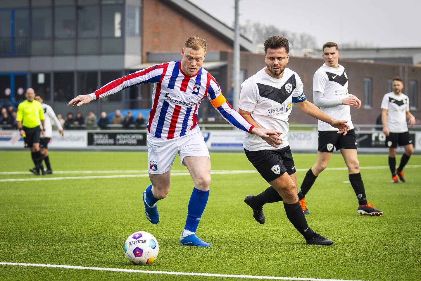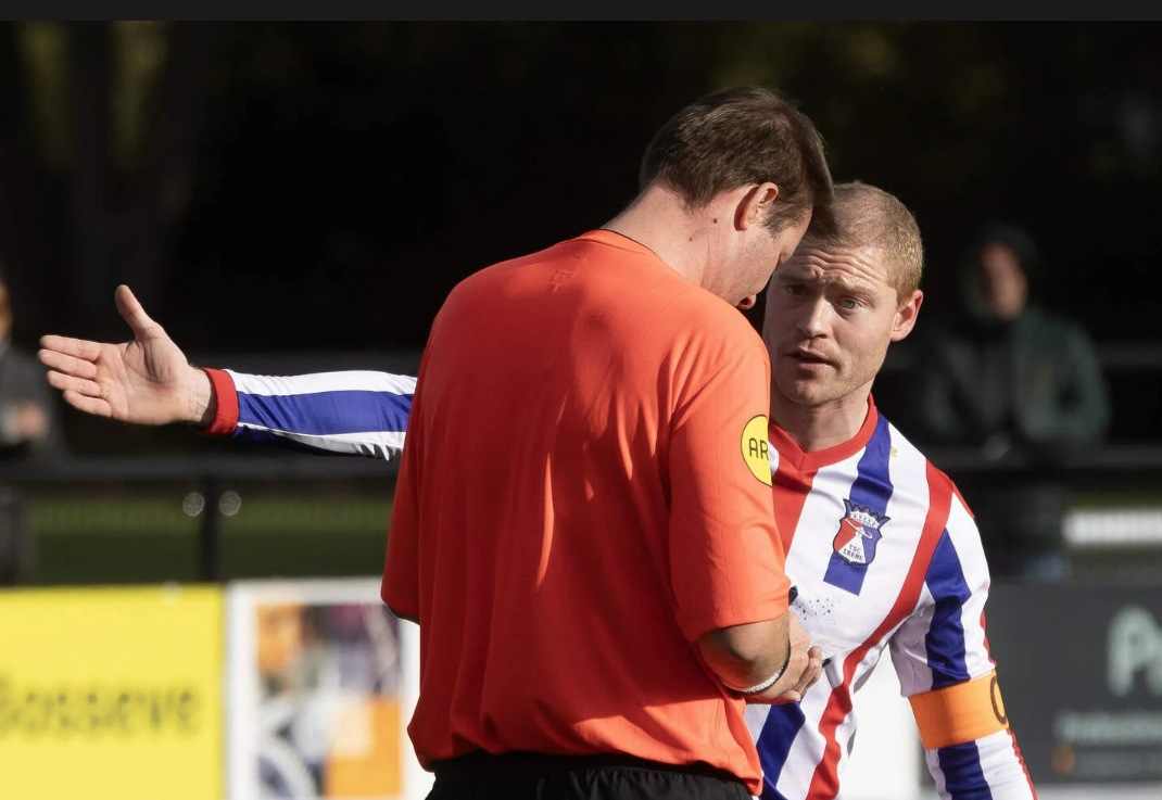 TSC Irene-captain Sierd Janssen in conclaaf met arbiter Schroijen in de wedstrijd tegen FC Oda. © Jeroen Kuit