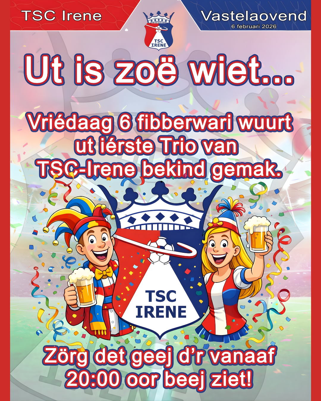 Vanavond is het eindelijk zover: het eerste Trio van TSC-Irene wordt bekendgemaakt! De spanning stijgt en we kunnen niet wachten om dit bijzondere moment samen met jullie te vieren. 🍻
